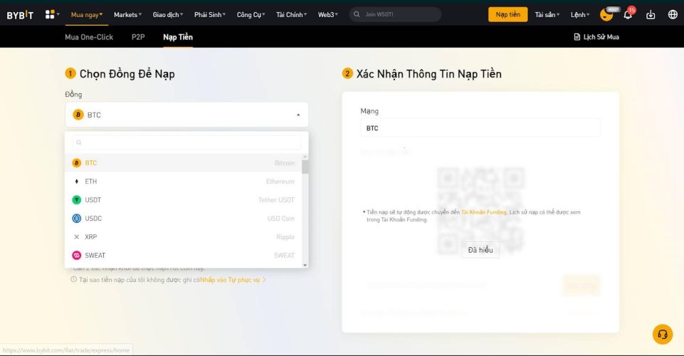 Chọn đồng coin bạn muốn nạp (ví dụ: USDT, BTC, ETH).