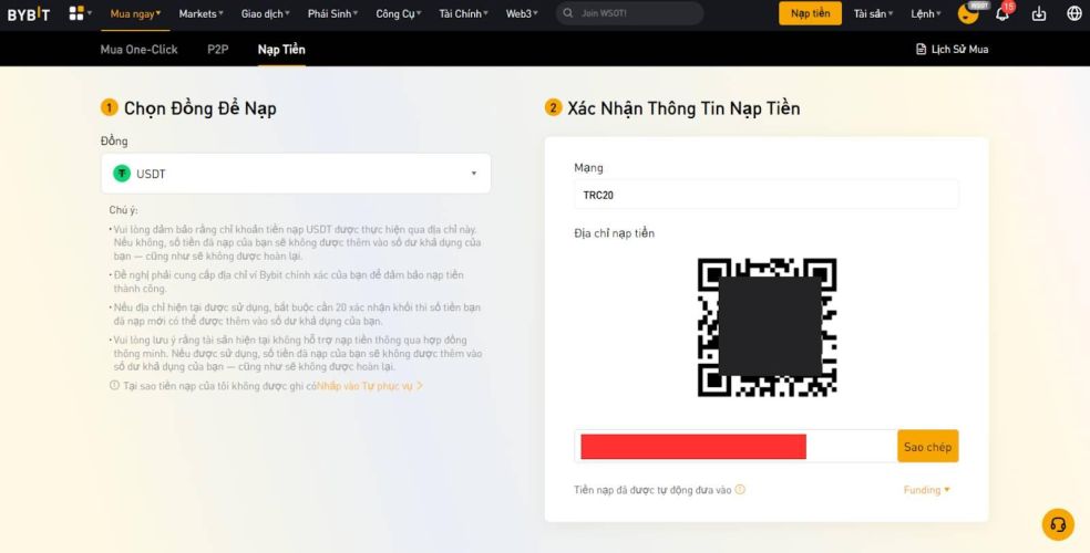 Ví dụ: Nếu bạn rút USDT từ sàn khác qua mạng BEP20 (BNB Smart Chain), bạn cũng phải chọn mạng BEP20 ở Bybit.