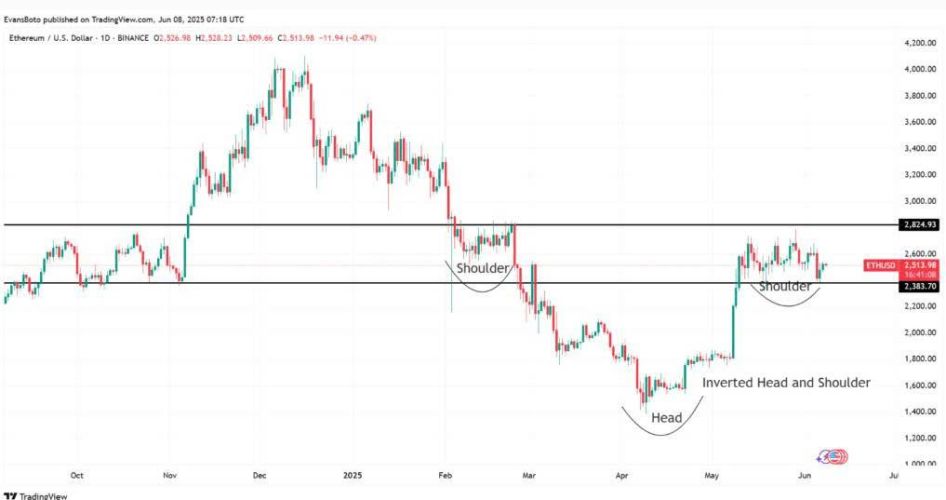 ETH đang di chuyển trong một mô hình vai–đầu–vai đảo ngược, thường được xem là dấu hiệu tăng giá kinh điển trong phân tích kỹ thuật. Hiện tại, giá đang giao dịch quanh $2.515,80, tăng nhẹ 0,87% trong ngày.