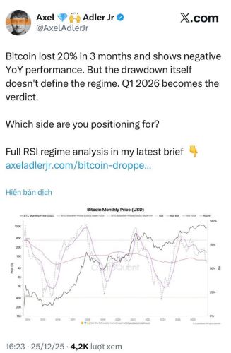 Dữ liệu on-chain mới nhất đang phát đi những tín hiệu đáng quan ngại khi chỉ báo RSI của Bitcoin bất ngờ rơi xuống vùng nhạy cảm, phá vỡ các mức trung bình quan trọng. Các chuyên gia từ CryptoQuant cảnh báo, 1-2 tháng tiếp theo sẽ là khoảng thời gian "sinh tử", quyết định liệu thị trường sẽ tìm thấy đáy để bật lên hay chìm sâu vào một đợt suy thoái mới.