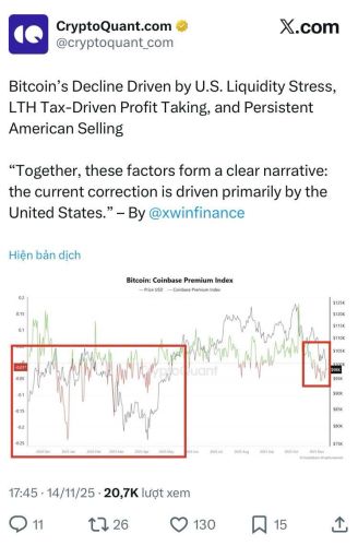 Theo phân tích từ Cryptoquant, đợt sụt giảm của Bitcoin xuống dưới mốc 100.000 USD phần lớn xuất phát từ các tác động của thị trường Hoa Kỳ. Dữ liệu chỉ ra rằng các nhà đầu tư Mỹ đang bán ra mạnh mẽ, lấn át hoàn toàn lực mua từ các nhà đầu tư ở châu Á và châu Âu. Điều này giải thích tại sao Bitcoin thường phục hồi nhẹ qua đêm (giờ châu Á/châu Âu) nhưng lại giảm mạnh khi phiên giao dịch Mỹ mở cửa.