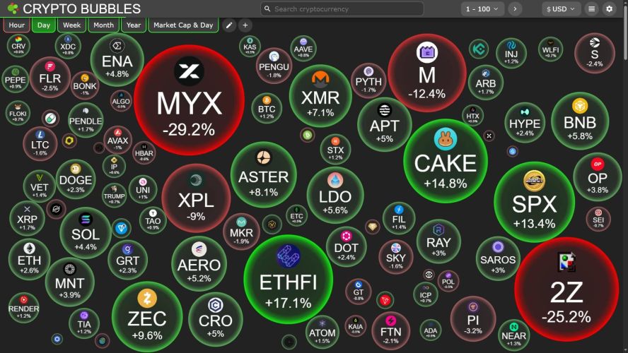 Biến động các đồng tiền mã hóa hàng đầu, ảnh chụp màn hình CryptoBubbles vào 09:15 AM ngày 03/10/2025