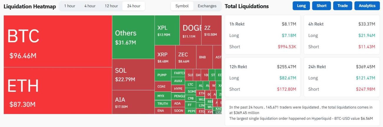 Sự đảo chiều đột ngột này đã gây ra một đợt thanh lý lớn trên thị trường phái sinh, với khoảng 370 triệu USD vị thế bị đóng trong 24 giờ qua. Đáng chú ý, có đến 67% trong số đó là các lệnh bán khống (short), cho thấy nhiều nhà đầu tư đã bất ngờ trước đà tăng của thị trường.
