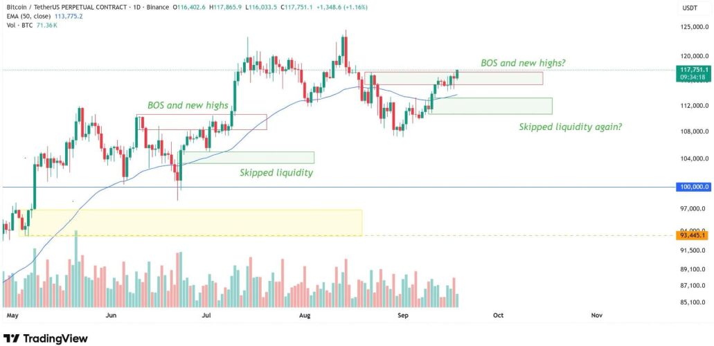 Mặc dù các yếu tố cơ bản đều nghiêng về kịch bản tăng giá, bức tranh kỹ thuật vẫn tồn tại những rủi ro cần lưu ý. Đà tăng 8,5% của Bitcoin trong tháng này (từ $107,000 lên $117,800) đã tạo ra những "khoảng trống thanh khoản" ở các vùng giá thấp hơn. Về lý thuyết, giá có xu hướng quay trở lại lấp đầy các khoảng trống này, mở ra khả năng một đợt điều chỉnh giảm ngắn hạn. Yếu tố mùa vụ, với tháng Chín thường là một tháng có hiệu suất kém, cũng là một lực cản tiềm tàng.