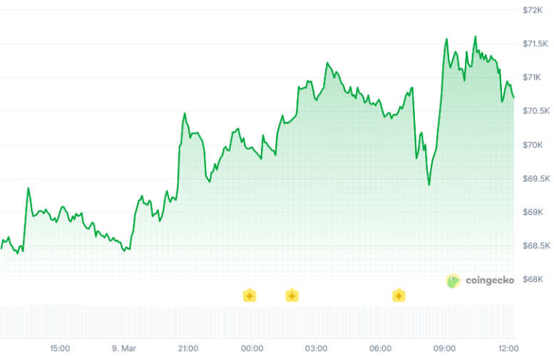 Chỉ báo dẫn dắt của thị trường là Bitcoin (BTC) đã có một phiên giao dịch bùng nổ. Đồng tiền mã hóa lớn nhất thế giới đã bứt phá thành công qua vùng kháng cự tâm lý, ghi nhận mức đỉnh trong ngày tại 71.800 USD trước khi ổn định quanh mức 70.700 USD (tăng 3,5% so với 24 giờ trước đó).