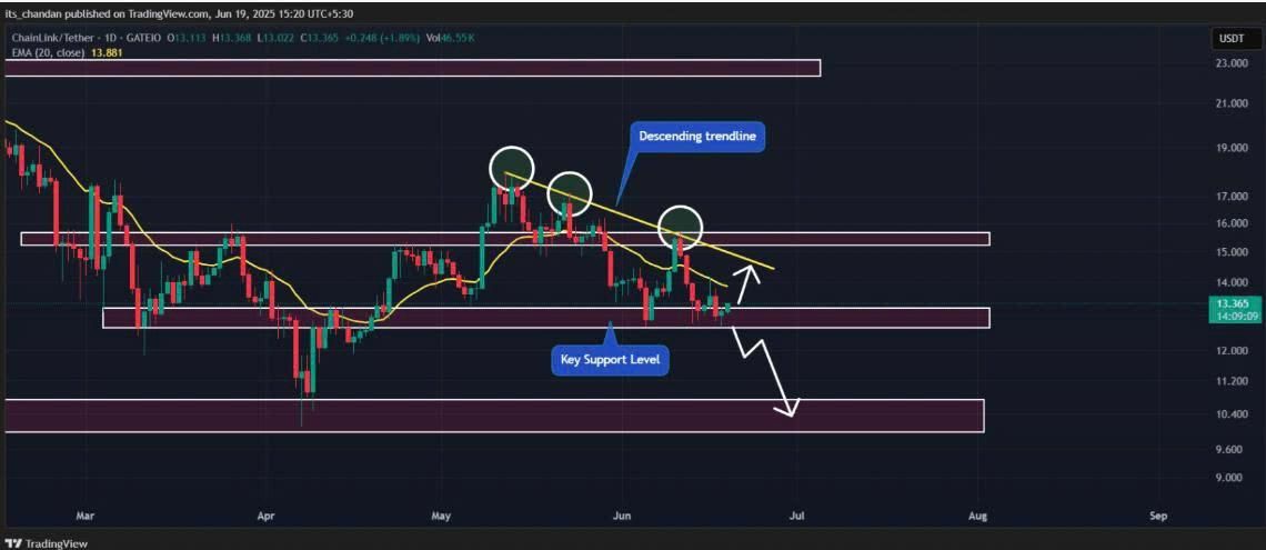Tại thời điểm viết bài, LINK đang giao dịch quanh mốc $13,15, ghi nhận mức hồi phục nhẹ +0,55% trong 24 giờ qua. Tuy nhiên, điều đáng chú ý không nằm ở mức giá, mà chính là vị trí kỹ thuật mà altcoin này đang “neo đậu”: vùng hỗ trợ $12,65–$13,15, từng nhiều lần đóng vai trò là “bệ phóng” hồi phục kể từ cuối tháng 4/2025. Một cú trượt dưới ngưỡng này có thể thổi bay tâm lý thị trường, kích hoạt hiệu ứng domino bán tháo mạnh hơn. Ngược lại, nếu lực cầu xuất hiện và giữ LINK trên vùng $13, nó có thể trở thành điểm đảo chiều kỹ thuật lý tưởng trong ngắn hạn.