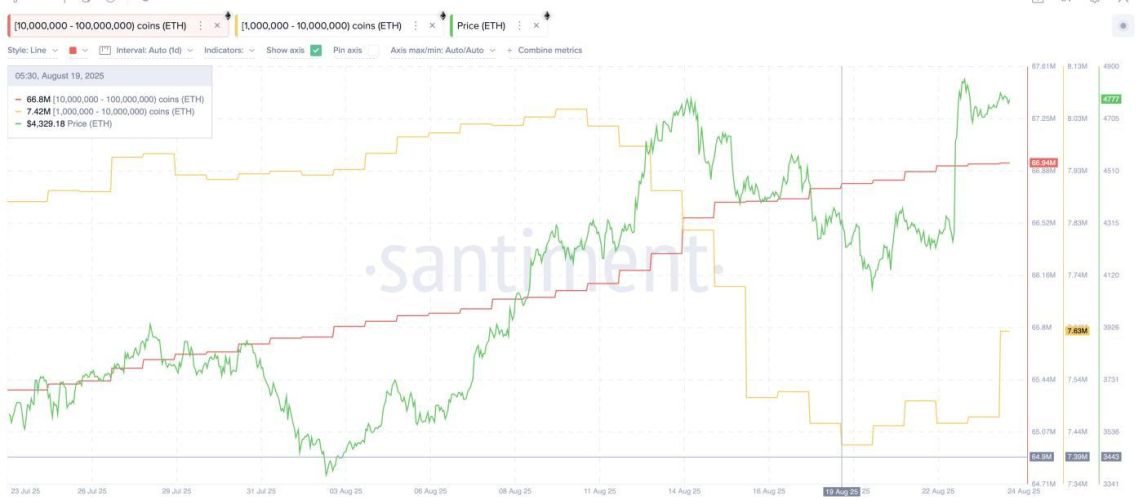 Nhóm ví từ 1 triệu - 10 triệu ETH: Đã gom thêm 210,000 ETH (trị giá khoảng 1 tỷ USD) kể từ ngày 19/08/2025, nâng tổng số nắm giữ từ 7.42 triệu lên 7.63 triệu ETH.