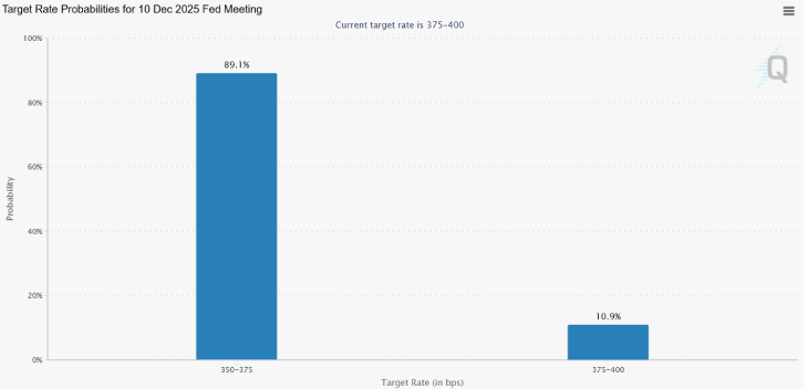Thị trường đang hình thành triển vọng tăng giá rõ rệt trước thềm ngày 10 tháng 12 – thời điểm diễn ra cuộc họp quan trọng của Cục Dự trữ Liên bang Mỹ (Fed). Công cụ dự báo của CME Group cho thấy có tới 89% khả năng Fed sẽ cắt giảm lãi suất 25 điểm cơ bản, một tin vui cho các tài sản rủi ro.