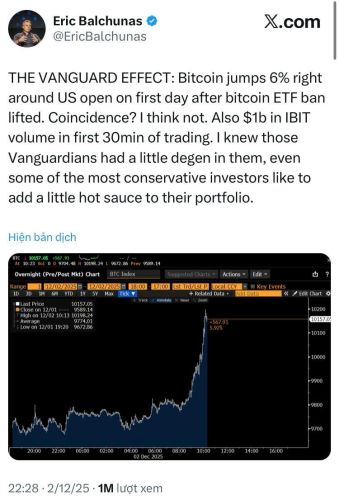 Vào ngày 2 tháng 12, Vanguard thông báo sẽ cho phép khách hàng môi giới tiếp cận các quỹ đầu tư và ETF tập trung vào Bitcoin, Ethereum, XRP và Solana. Đây được xem là bước ngoặt quan trọng, xóa bỏ rào cản tâm lý cho dòng tiền truyền thống đổ vào thị trường.