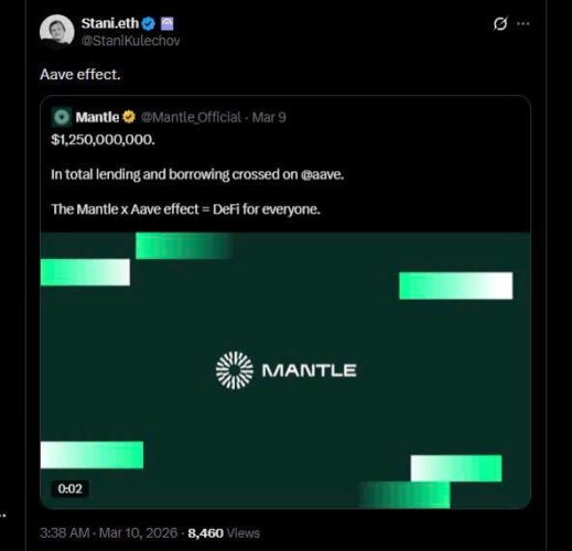 Sự cộng hưởng khủng khiếp: Kể từ khi tích hợp vào giữa tháng 2, AAVE đã kích hoạt dòng vốn chảy vào Mantle với tốc độ chóng mặt. TVL của mạng lưới đã tăng gần gấp 4 lần (từ 255 triệu USD lên hơn 1 tỷ USD).