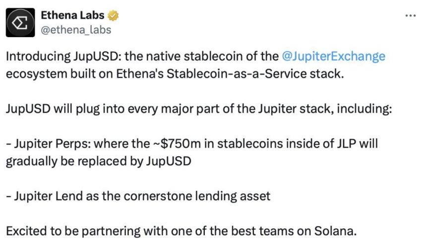 Ethena Labs, đơn vị đứng sau hai stablecoin đình đám USDe (vốn hóa 14,8 tỷ USD) và USDtb (vốn hóa 1,8 tỷ USD), xác nhận rằng JupUSD được xây dựng trên nền tảng "dịch vụ stablecoin nhãn trắng" của mình. Đây là một khuôn khổ cho phép các dự án khác phát hành stablecoin mang thương hiệu riêng nhưng tận dụng hoàn toàn cơ sở hạ tầng và cơ chế quản lý tài sản bảo chứng của Ethena.