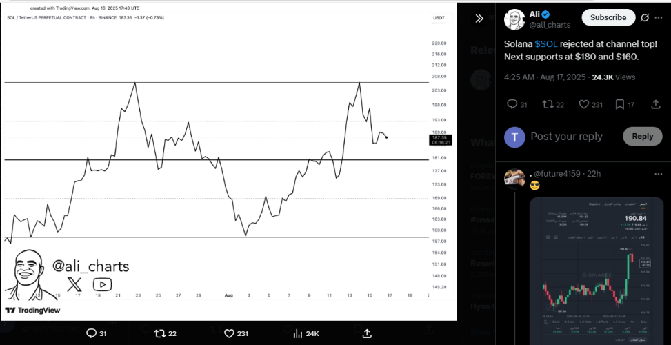 Trong một bài đăng vào ngày 16/8, chuyên gia phân tích thị trường uy tín Ali Martinez đã đưa ra một cảnh báo rõ ràng về rủi ro tiềm ẩn của Solana. Ông nhấn mạnh rằng con đường phía trước của SOL không hề bằng phẳng.
