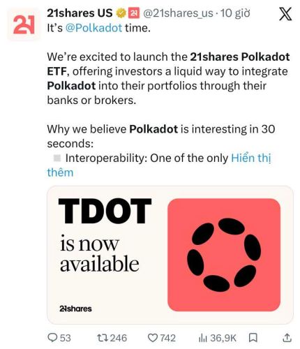 Sự xuất hiện của TDOT không chỉ đơn thuần là một sản phẩm tài chính mới, mà còn là lời khẳng định vị thế của Polkadot — một mạng lưới "blockchain của các blockchain" với khả năng tương tác vượt trội. Bước đi này đưa Polkadot gia nhập "câu lạc bộ" các altcoin có ETF của 21Shares cùng với XRP, Solana, Sui và Dogecoin. Ngay sau sự kiện, nhân vật tầm cỡ trong giới tài chính là Anthony Scaramucci đã gửi lời chúc mừng, coi đây là một chứng chỉ uy tín cho sự trưởng thành của hệ sinh thái Polkadot.