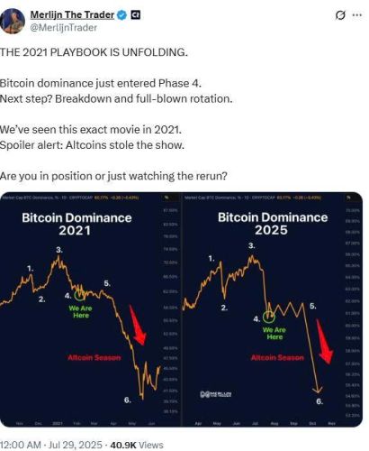 Những nhà đầu tư lâu năm không thể không nhớ về "mùa hè điên rồ" năm 2021, khi các altcoin tăng giá phi mã, mang lại lợi nhuận khổng lồ chỉ trong vài tháng. Trader kỳ cựu Merlijn cho rằng kịch bản hiện tại đang phản chiếu một cách kỳ lạ những gì đã xảy ra khi đó. Theo ông, thị trường đang bước vào "Giai đoạn 4" – giai đoạn cuối cùng trong chu kỳ thống trị của Bitcoin. Đây là lúc dòng vốn, sau khi đã tích lũy đủ lợi nhuận từ Bitcoin, bắt đầu tìm kiếm những cơ hội rủi ro hơn nhưng tiềm năng lợi nhuận cao hơn ở các altcoin. Giống như một con đập lớn, dòng vốn chỉ chờ một vết nứt để tuôn chảy ồ ạt sang vùng đất altcoin màu mỡ.