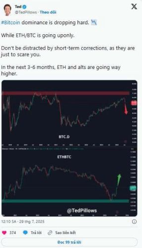 Nếu Mùa Altcoin là một bản giao hưởng, thì Ethereum (ETH) gần như chắc chắn sẽ là nhạc trưởng. Một trong những chỉ báo kinh điển nhất để dự đoán mùa altcoin chính là cặp tỷ giá ETH/BTC. Khi BTC.D sụt giảm, cặp ETH/BTC đang có dấu hiệu mạnh lên rõ rệt. Điều này có nghĩa là Ethereum đang tăng giá nhanh hơn Bitcoin, cho thấy các nhà đầu tư lớn đang ưu tiên "rót tiền" vào ETH như một bước đệm trước khi phân bổ rộng hơn ra thị trường. Nhà đầu tư Ted nhấn mạnh: “Trong 3–6 tháng tới, Ethereum và nhiều altcoin khác có thể sẽ tăng trưởng đáng kể. Những đợt điều chỉnh ngắn hạn chỉ nhằm ‘thanh lọc’ thị trường trước một chu kỳ tăng trưởng mới.” Sự dẫn dắt của Ethereum có ý nghĩa vô cùng quan trọng. Nó không chỉ tự mình tăng trưởng mà còn tạo ra hiệu ứng lan tỏa, kéo theo sự phục hồi của toàn bộ hệ sinh thái, từ các dự án Layer 2, DeFi cho đến các dự án có vốn hóa thấp hơn.
