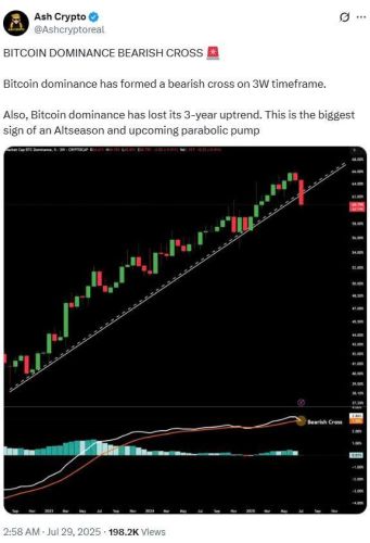 Hãy tưởng tượng thị trường crypto như một chiếc bánh khổng lồ. Trong suốt ba năm qua, Bitcoin luôn chiếm phần lớn nhất và ngày càng lớn hơn. Nhưng giờ đây, miếng bánh đó đang bắt đầu được san sẻ. Về mặt kỹ thuật, BTC.D đã chính thức phá vỡ đường xu hướng tăng (uptrend line) kéo dài từ cuối năm 2021. Đối với các nhà phân tích, đây không phải là một cú trượt chân thông thường, mà là một cú ngã có thể thay đổi toàn bộ cục diện cuộc chơi. Đáng chú ý hơn, trên khung thời gian 3 tuần – một khung đồ thị dài hạn thể hiện xu hướng vĩ mô – một “giao cắt giảm giá” (bearish cross) đã hình thành. Đây là một tín hiệu kỹ thuật cực kỳ mạnh mẽ, thường báo hiệu sự kết thúc của một chu kỳ tăng trưởng và mở ra một giai đoạn giảm giá hoặc đi ngang kéo dài. Nhà phân tích thị trường nổi tiếng Ash Crypto đã không ngần ngại tuyên bố: “Sự thống trị của Bitcoin đã mất đi xu hướng tăng trưởng kéo dài 3 năm. Đây là dấu hiệu rõ ràng nhất cho thấy một mùa Altseason và đợt tăng giá parabol sắp tới.”