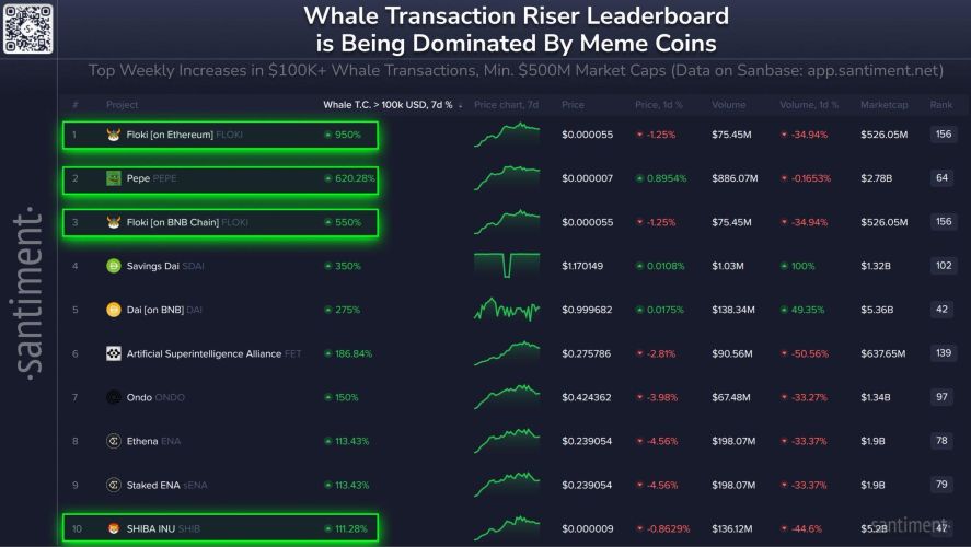 Dữ liệu từ Santiment ghi nhận mức tăng giá ấn tượng của các token mới nổi như PEPE, POPCAT và MOG, đóng góp đáng kể vào sự phục hồi vốn hóa chung của toàn ngành. Song song đó, các "cựu binh" có cộng đồng lớn như Dogecoin (DOGE) và Shiba Inu (SHIB) cũng duy trì đà tăng ổn định.