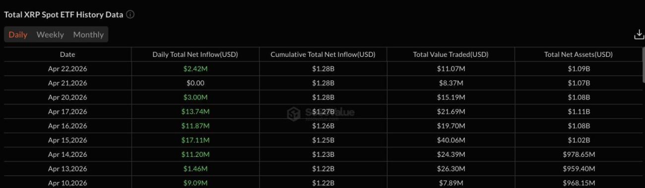 Ở chiều ngược lại, các quỹ US spot XRP ETF lại có góc nhìn hoàn toàn khác. Trong 9 phiên giao dịch gần nhất, đã có 8 phiên ghi nhận dòng tiền vào ròng. Đặc biệt: