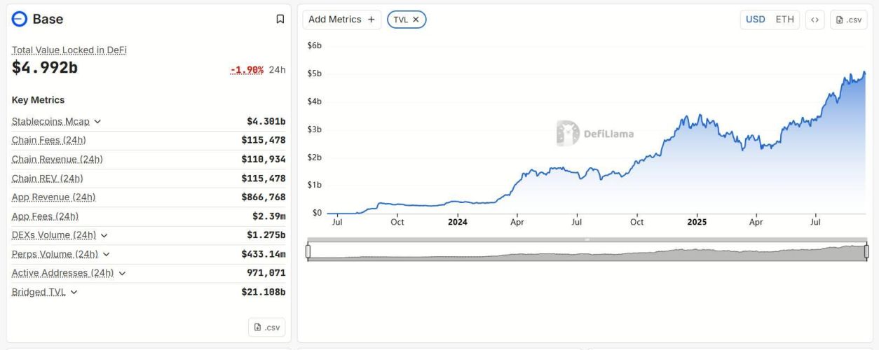 Ra mắt năm 2023 trên nền tảng OP Stack, với sự hậu thuẫn vững chắc từ Coinbase, Base đã nhanh chóng vươn lên trở thành một thế lực trong thế giới layer-2, sở hữu gần 5 tỷ USD tổng giá trị bị khóa (TVL) cùng một hệ sinh thái đa dạng.