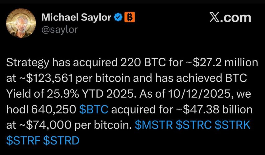 Trong khi nhiều nhà đầu tư hoảng loạn bán tháo, Strategy, công ty đại chúng do Michael Saylor lãnh đạo, lại hành động ngược lại. Công ty vừa công bố đã chi 27,2 triệu USD để mua thêm 220 Bitcoin, với mức giá trung bình là 123.561 USD mỗi đồng. Giao dịch này được thực hiện ngay trong đợt sụt giảm mạnh của thị trường gần đây, khi giá Bitcoin có thời điểm lùi về mốc 105.000 USD.