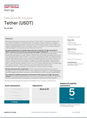 Trong một động thái gây chấn động thị trường tài chính hôm thứ Tư, S&P Global Ratings – một trong những tổ chức xếp hạng tín nhiệm uy tín nhất thế giới – đã đưa ra cảnh báo nghiêm khắc đối với Tether (USDT). S&P chính thức hạ mức đánh giá khả năng duy trì giá trị ổn định của đồng stablecoin lớn nhất thế giới này xuống mức "Yếu" (Weak).