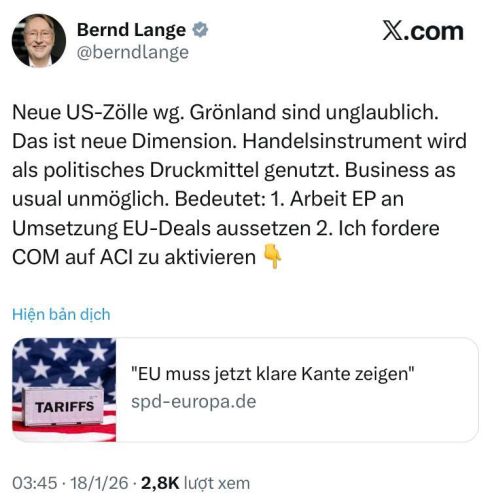 Ông Bernd Lange, Chủ tịch Ủy ban Thương mại của Nghị viện Châu Âu, khẳng định tôn trọng chủ quyền quốc gia là điều kiện tiên quyết của mọi cuộc chơi. Ông kêu gọi tạm dừng mọi thỏa thuận cho đến khi các mối đe dọa chấm dứt, đồng thời đề xuất EU kích hoạt "công cụ chống cưỡng chế" (ACI) – một vũ khí pháp lý hạng nặng chưa từng được sử dụng – để đáp trả sòng phẳng nếu cần thiết.