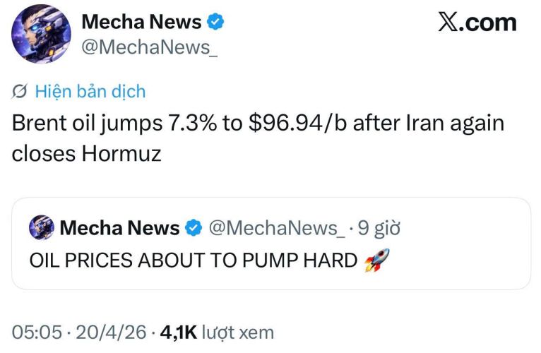 Những biến động địa chính trị này đã tạo nên một cú sốc ngay lập tức lên nền kinh tế toàn cầu. Ngay sau khi Iran tuyên bố tái đóng cửa eo biển Hormuz – "yết hầu" vận tải năng lượng của thế giới, giá dầu thô Brent đã bật tăng mạnh 7,3%, đẩy giá lên mức 96,94 USD/thùng.