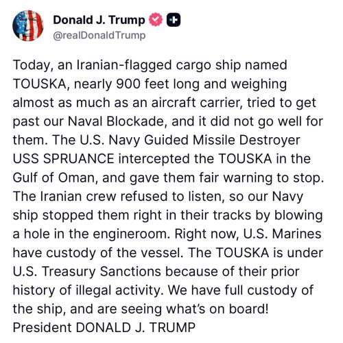 Căng thẳng Mỹ - Iran vừa chính thức bước sang một chương mới đầy bất ổn sau sự cố nghiêm trọng tại Vịnh Oman. Tổng thống Mỹ Donald Trump xác nhận tàu khu trục USS Spruance thuộc Hải quân Mỹ đã thực hiện chiến dịch chặn bắt thành công tàu chở hàng mang tên “Touska” – con tàu được tình báo Mỹ xác định có mối liên hệ mật thiết với Iran.
