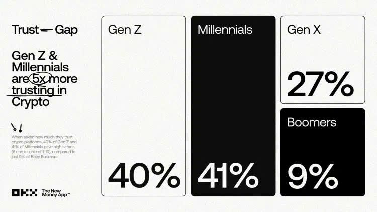 Sự chênh lệch này không chỉ nằm ở ý định đầu tư mà còn phản ánh niềm tin cốt lõi. Trong khi 40% Gen Z và 41% Millennials dành sự tin tưởng lớn cho các nền tảng crypto, thì chỉ 9% Baby Boomer cảm thấy an tâm khi đặt tiền vào đây.