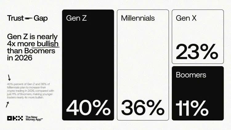 Thị trường tài chính năm 2026 đang chứng kiến sự phân hóa sâu sắc chưa từng có. Theo báo cáo được OKX thực hiện vào tháng 1/2026 dựa trên ý kiến của 1.000 người Mỹ, Gen Z chính là nhóm đối tượng "chịu chơi" nhất hiện nay.