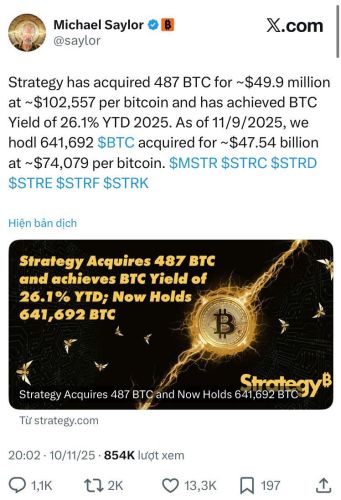 Công ty của vị tỷ phú này, hiện mang tên Strategy (trước đây là MicroStrategy), đã không ngần ngại chi 49,9 triệu đô la để bổ sung thêm 487 BTC vào kho lưu trữ của mình.