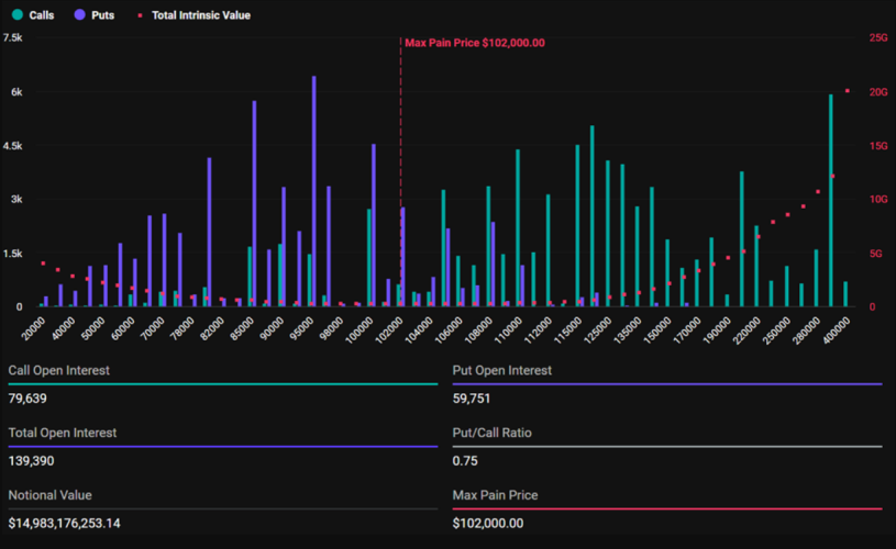 BTC: Max Pain ở mức 102.000 USD, với tỷ lệ put-to-call là 0,75