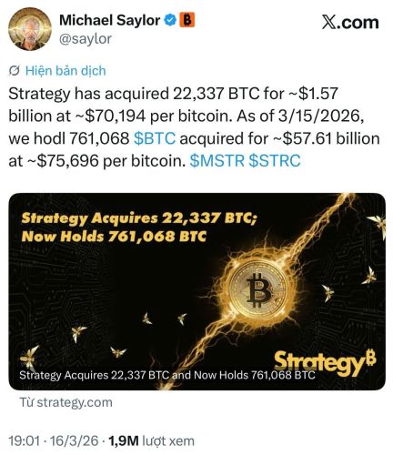 Lãnh đạo MicroStrategy tiếp tục khẳng định niềm tin mãnh liệt vào tương lai dài hạn của thị trường tiền mã hóa khi xác nhận hoàn tất mua thêm 22.337 Bitcoin. Đây là đợt thu gom quy mô nhất kể từ tháng 11/2024, nâng tổng tài sản tiền số của gã khổng lồ này lên mức 761.068 BTC, với mức giá trung bình khoảng 75.696 USD/BTC.