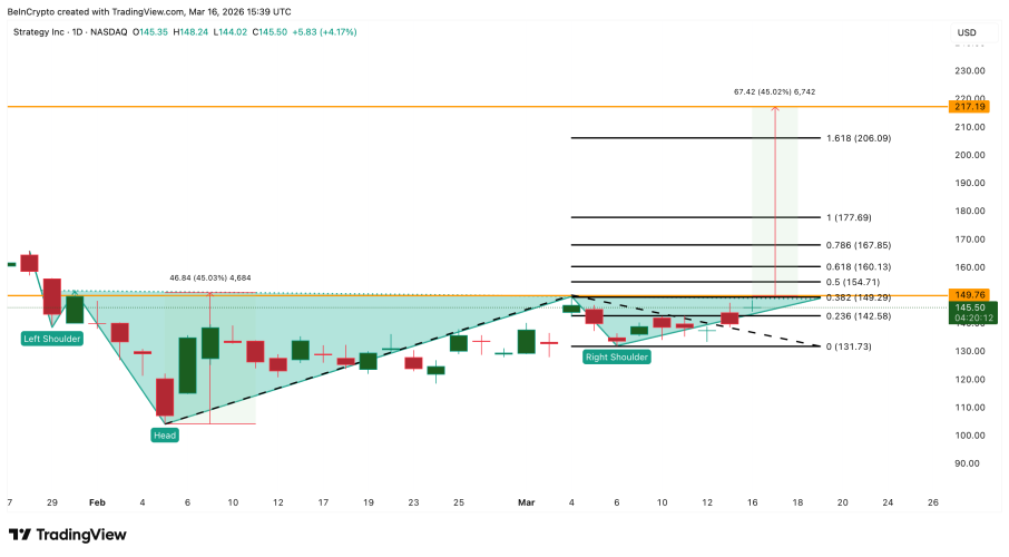 Về mặt hành vi giá, MSTR đang vẽ nên mô hình "Vai - Đầu - Vai ngược" kinh điển – tín hiệu báo mộng về sự đảo chiều xu hướng cực mạnh. Điểm thú vị là đường viền cổ (neckline) của mô hình này lại nằm chính xác tại vùng 149–150 USD. Theo thống kê kỹ thuật, nếu giá vượt qua được phòng tuyến này, xác suất bứt phá thành công có thể lên tới 45%.