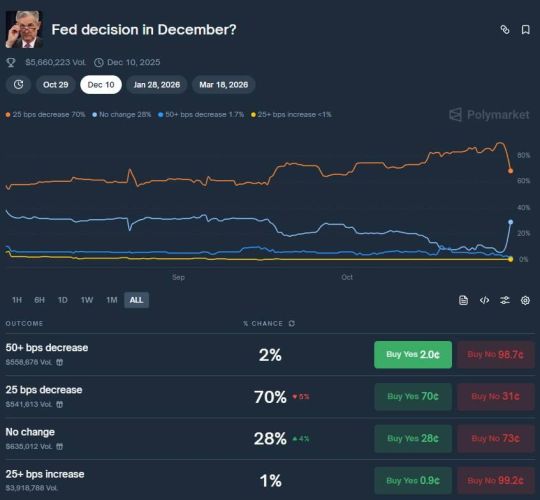 Phát biểu này ngay lập tức làm giảm kỳ vọng của thị trường. Xác suất về một đợt cắt giảm lãi suất tiếp theo trong tháng 12 trên các thị trường dự đoán (như Polymarket và CME FedWatch) đã giảm mạnh từ mức 90% xuống chỉ còn 70%.