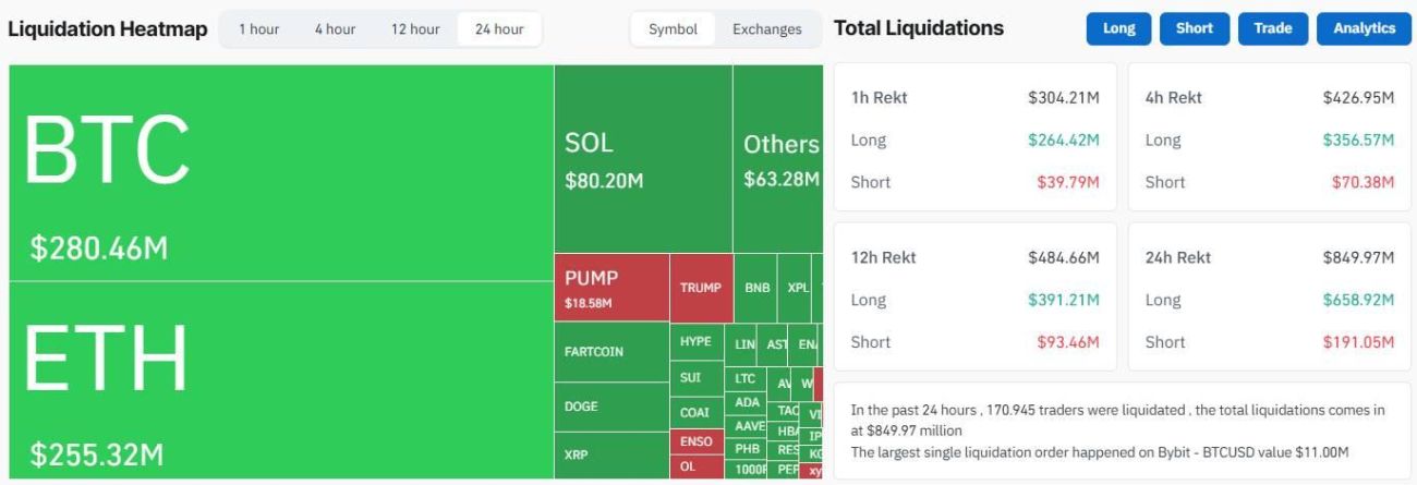 Dữ liệu từ CoinGlass cho thấy một đợt thanh lý quy mô lớn. Trong 24 giờ qua, 850 triệu USD vị thế đã bị "thổi bay", trong đó có tới 658,92 triệu USD là các lệnh long (chiếm 77,5%), phản ánh sự hoang mang của các nhà giao dịch đang đặt cược vào kịch bản nới lỏng mạnh mẽ hơn.