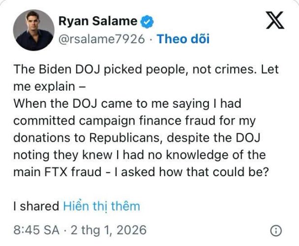 Bức màn nhung của thảm họa tài chính FTX dường như vẫn chưa hoàn toàn khép lại. Từ một vụ án gian lận tỷ đô đơn thuần, câu chuyện giờ đây đang bị đẩy lên cao trào mới khi các nhân vật chủ chốt như Ryan Salame và Sam Bankman-Fried (SBF) bất ngờ chĩa mũi dùi vào chính cơ quan công tố. Những tuyên bố mới nhất của họ đã khơi mào cho một cuộc tranh luận nảy lửa: Liệu dưới thời chính quyền Biden, các công tố viên có đang thực thi công lý một cách "có chọn lọc" đối với các tàn dư của sàn giao dịch này hay không?
