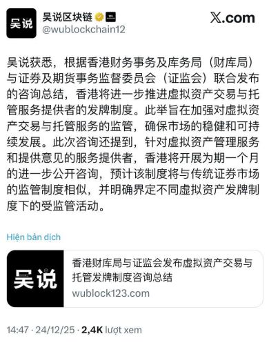 Trong nỗ lực không ngừng nghỉ nhằm định hình lại bối cảnh tài chính kỹ thuật số, Hồng Kông đang tiến thêm một bước dài trên con đường chuyên nghiệp hóa thị trường tiền điện tử. Ngày 24 tháng 12 vừa qua, Cục Dịch vụ Tài chính và Kho bạc cùng Ủy ban Chứng khoán và Hợp đồng tương lai (SFC) đã phát đi thông báo quan trọng thông qua bản tóm tắt tham vấn mới nhất.