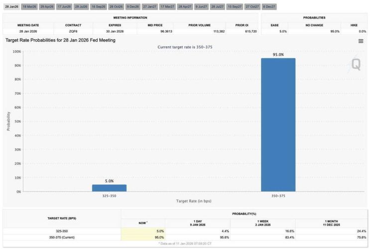 Công cụ CME FedWatch hiện cho thấy tâm lý thị trường đang thay đổi chóng mặt: Có tới 95% khả năng Fed sẽ giữ nguyên lãi suất trong cuộc họp tháng Giêng, tăng mạnh so với con số 86% trước khi có báo cáo việc làm.