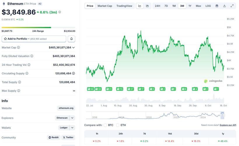 Biến động giá ETH trong 3 tháng qua, ảnh chụp màn hình CoinGecko vào 09:55 AM ngày 18/10/2025