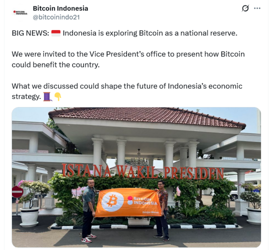 Gần đây, tổ chức Bitcoin Indonesia đã có một buổi làm việc cấp cao với văn phòng Phó Tổng thống Gibran Rakabuming Raka. Nội dung chính của cuộc họp, theo thông tin được công bố, là trình bày về tiềm năng của Bitcoin như một tài sản dự trữ chiến lược.
