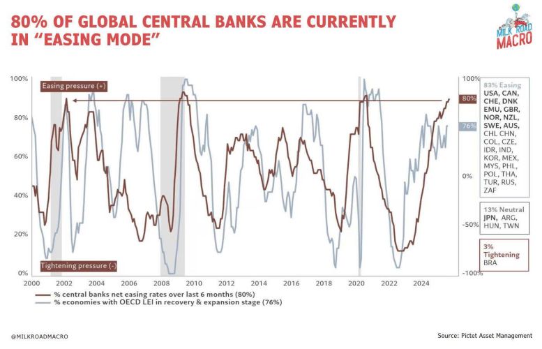 Tuy nhiên, quan điểm "ủng hộ kích thích" của tân thủ tướng Takaichi có thể sẽ "buộc" Nhật Bản phải sớm nới lỏng chính sách. Theo nguồn tin từ nền tảng đầu tư vĩ mô Milk Road Macro vào ngày 8 tháng 10, bối cảnh toàn cầu cũng ủng hộ điều này, khi 80% các ngân hàng trung ương trên thế giới hiện đã theo đuổi các nỗ lực QE.