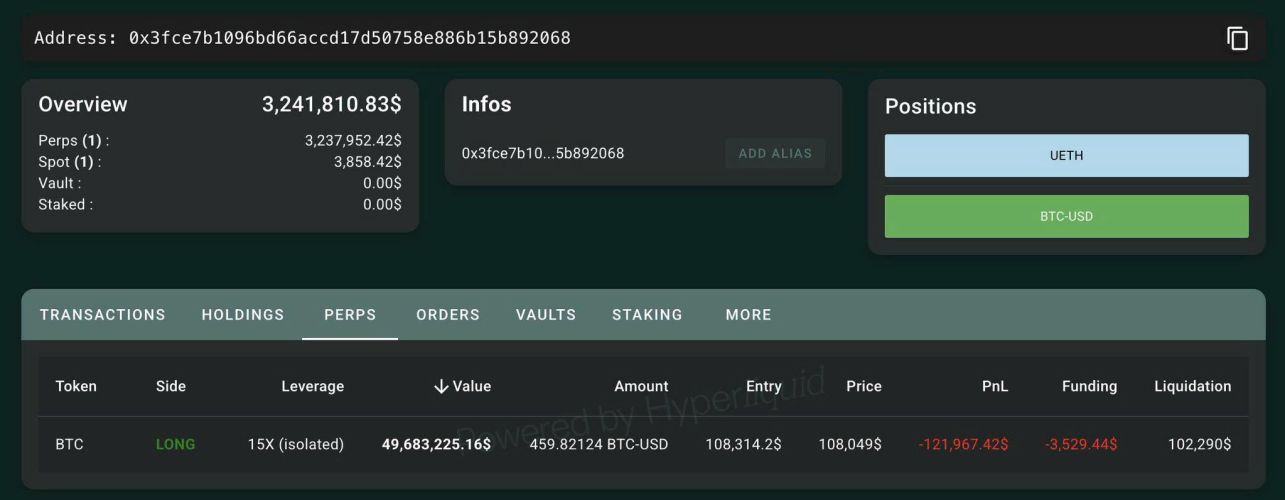Nền tảng phân tích dữ liệu blockchain Lookonchain đã chỉ ra trong một bài đăng trên X vào thứ Tư: một ví cá voi có định danh "0x3fce" đã nâng tổng vị thế long Bitcoin của mình lên 49,7 triệu USD. Trong khi đó, một ví cá voi khác ("0x89AB") cũng đã mở một vị thế long trị giá 14 triệu USD với mức đòn bẩy gấp 6 lần (6x).