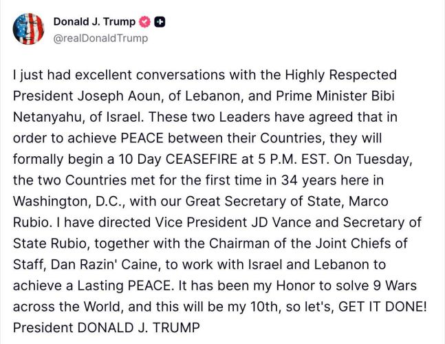 Vào rạng sáng ngày hôm nay (theo giờ Việt Nam), Tổng thống Mỹ Donald Trump đã chính thức xác nhận một thành tựu ngoại giao quan trọng: Israel và Lebanon đã đồng ý tạm ngưng tiếng súng trong vòng 10 ngày. Thỏa thuận này bắt đầu có hiệu lực từ 5 giờ chiều (giờ EST), đánh dấu kết quả sau những nỗ lực đàm phán không mệt mỏi.