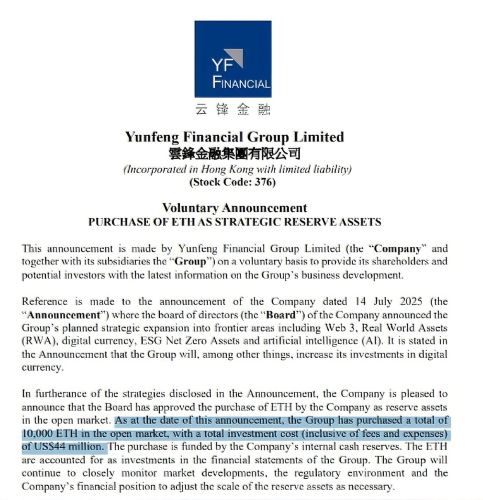 Thị trường tài sản số vừa chứng kiến một động thái gây chú ý lớn khi Yunfeng Financial Group, tập đoàn tài chính niêm yết tại Hong Kong và có liên hệ mật thiết với nhà sáng lập Alibaba Jack Ma, công bố đã chi 44 triệu USD từ nguồn vốn nội bộ để mua 10.000 ETH. Giao dịch này ngay lập tức tạo ra một cuộc thảo luận sâu rộng, không chỉ về giá trị của Ethereum mà còn về sự thay đổi mang tính kiến tạo trong chiến lược của các gã khổng lồ tài chính truyền thống.