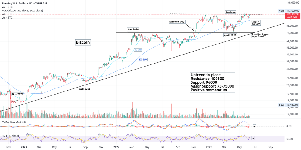 Tính đến sáng ngày 27/6/2025, Bitcoin (BTC) đang giao dịch quanh mốc $107.000, ghi nhận mức tăng gần 1.3% trong vòng 24h. Dưới góc độ kỹ thuật, BTC đã bật tăng từ vùng hỗ trợ mạnh tại $99.500–$100.000, trùng với đường MA50 trên khung D1 – một tín hiệu cho thấy phe bò vẫn chưa từ bỏ thế chủ động. Biểu đồ kỹ thuật (khung D1) cho thấy: