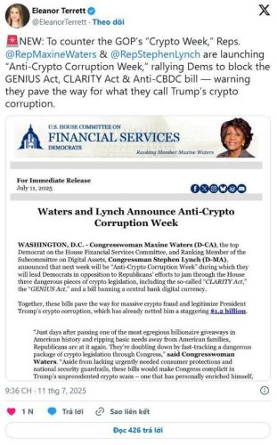 Tất nhiên, phe đối lập không hề ngồi yên. Dẫn đầu bởi các nhà lập pháp kỳ cựu như Đại diện Maxine Waters và Stephen Lynch, một chiến dịch phản công mang tên "Tuần lễ Chống Tham nhũng Tiền Điện tử" đang được phát động. Họ cho rằng các dự luật GENIUS và CLARITY là quá "dễ dãi", do Đảng Cộng hòa hậu thuẫn và có nguy cơ bỏ qua các biện pháp bảo vệ người tiêu dùng cần thiết. Hơn nữa, họ còn dấy lên những lo ngại về đạo đức liên quan đến các hoạt động tiền điện tử của cựu Tổng thống Donald Trump, bao gồm cả memecoin TRUMP và mối quan hệ của ông với World Liberty Financial. Phe đối lập yêu cầu các quy định chặt chẽ hơn, tính minh bạch tuyệt đối và sự giám sát đạo đức nghiêm ngặt.