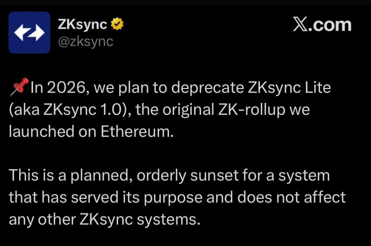 Theo thông báo chính thức từ đội ngũ phát triển Matter Labs, ZKsync Lite (trước đây là ZKsync 1.0) sẽ bắt đầu quy trình ngừng hoạt động (sunset process) và chính thức đóng cửa vào năm 2026.