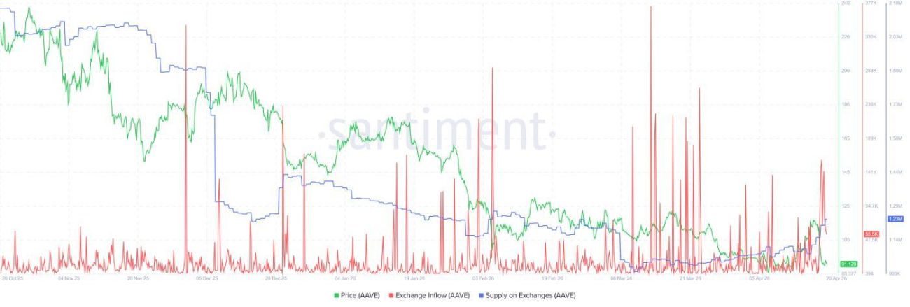 Thị trường đang chia rẽ sâu sắc về tương lai của AAVE, và dữ liệu on-chain dường như đang đứng về phía phe bán. Theo thống kê từ Santiment, trong hai ngày gần đây, lượng AAVE được nạp lên các sàn giao dịch đã tăng vọt, đánh dấu đợt inflow lớn nhất kể từ tháng 03/2026. Đây chính là động lực đẩy giá từ vùng 112 USD lao dốc không phanh về mốc 90 USD như hiện tại.