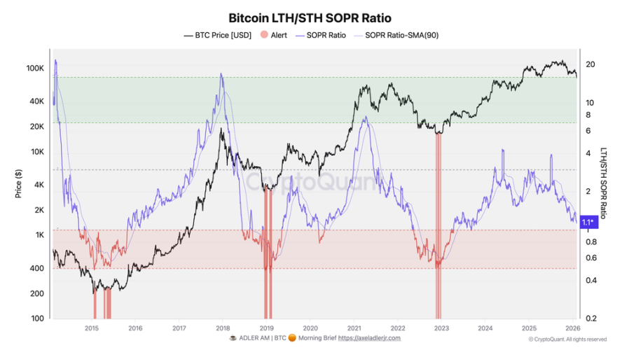 Biểu đồ tỷ lệ SOPR LTH/STH của Bitcoin cho thấy tỷ lệ lợi nhuận của số coin đã chi tiêu giữa người nắm giữ dài hạn và người nắm giữ ngắn hạn. Nguồn-axeladlerjr